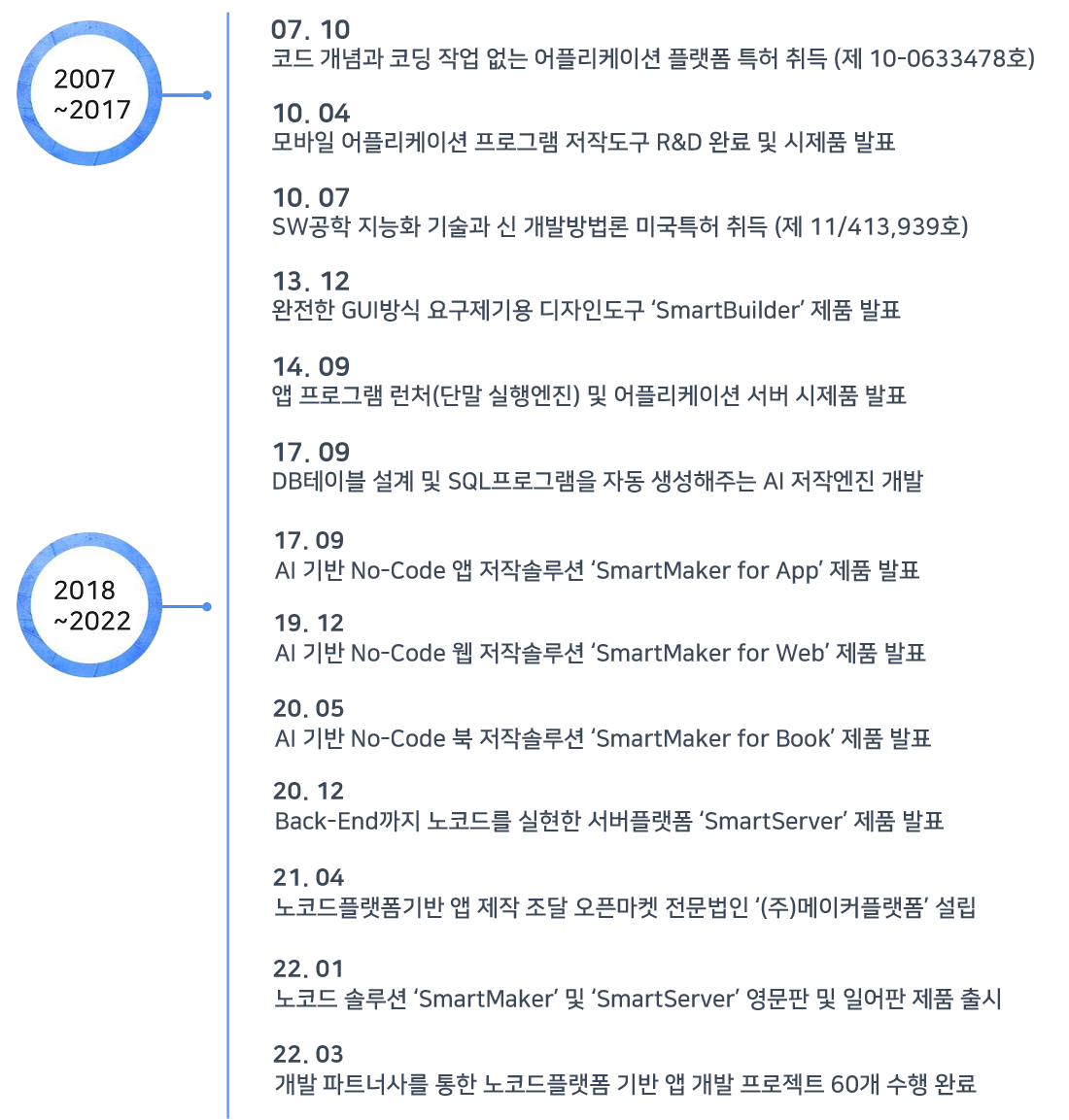 (주)메이커플랫폼은, 최신 AI기술을 활용한 노코드플랫폼 '스마트메이커'로 글로벌 No-Code 기술시장을 선도하는 (주)소프트파워의 앱 제작 및 조달 오픈마켓 사업전담 자회사로 2021년 4월에 설립됨