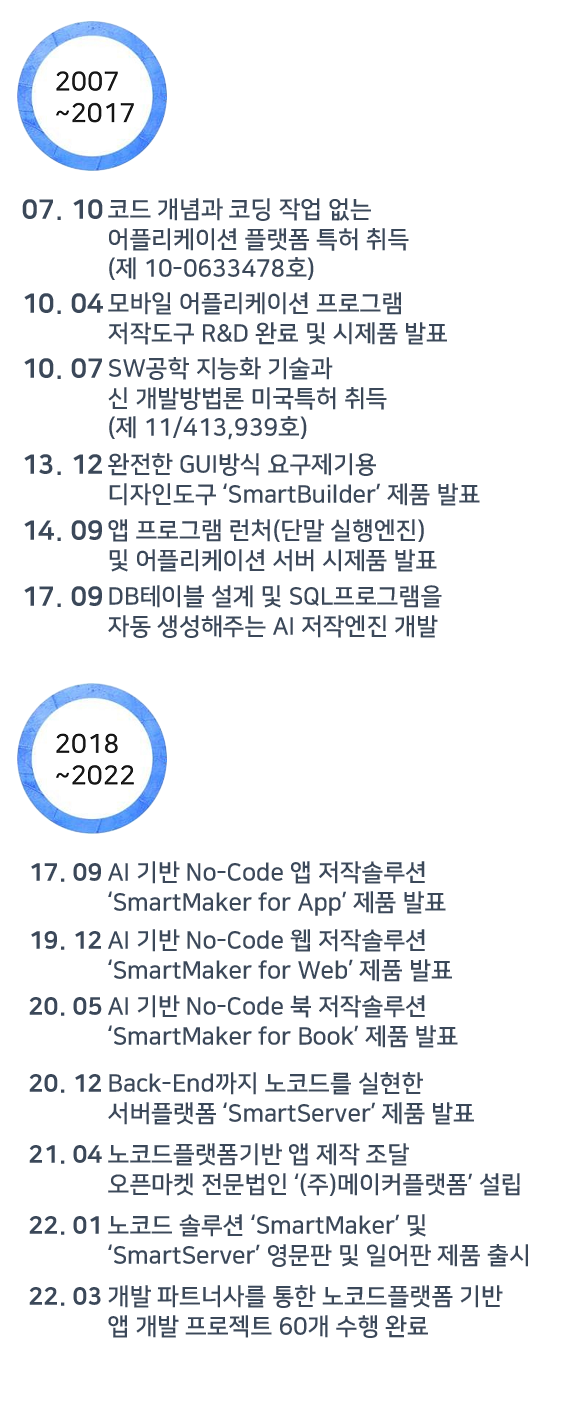 (주)메이커플랫폼은, 최신 AI기술을 활용한 노코드플랫폼 '스마트메이커'로 글로벌 No-Code 기술시장을 선도하는 (주)소프트파워의 앱 제작 및 조달 오픈마켓 사업전담 자회사로 2021년 4월에 설립됨