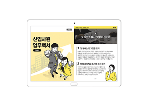 이런 문제를 해결하기 위해 디지털 북 형태로 사규나 지침서 등을 제작하고 각 담당자 개인의 스마트폰에 다운로드 받아 사용하게 지원해줍니다. 특히 복잡한 검색 조건이나 연산처리 및 의사결정 등을 지원하는 프로그램 기능까지 함께 내장해서 업무처리의 능률을 극대화해주는 스마트콘텐츠입니다.